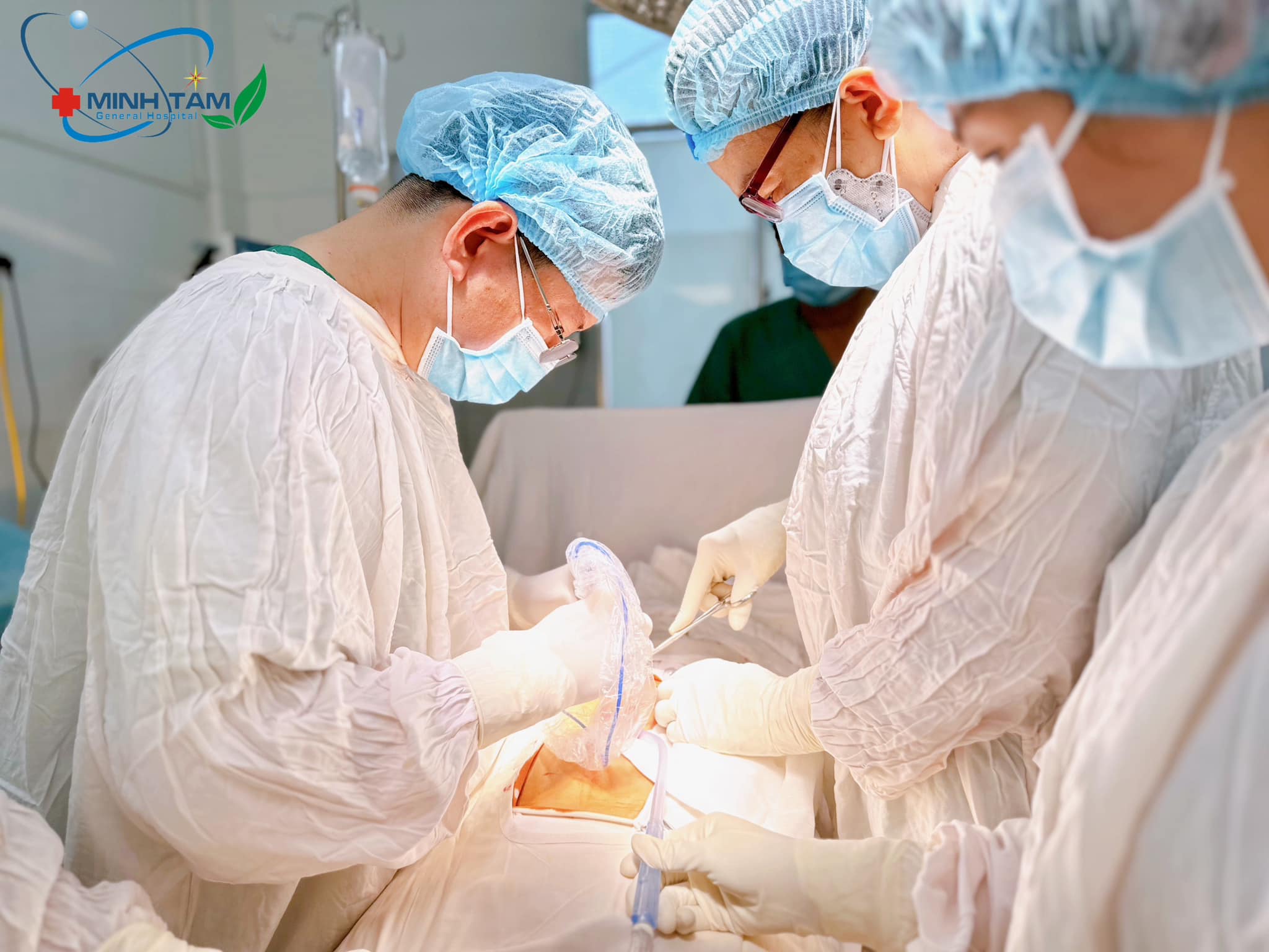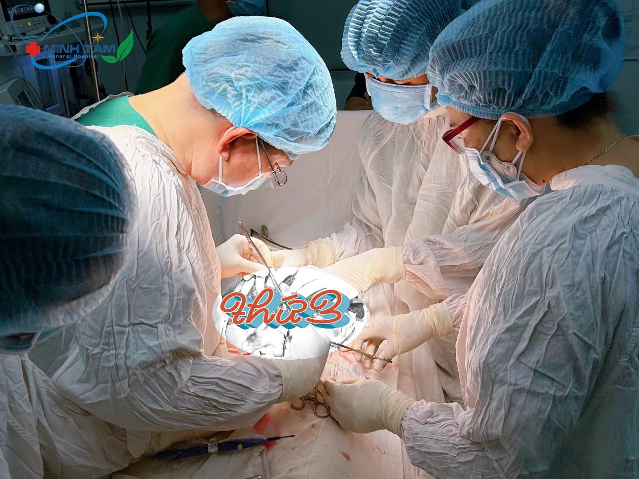Bác sĩ chỉ định phải phẫu thuật ngay, vì đây trường hợp khẩn cấp do dị vật đã 𝐨̛̉ 𝐭𝐫𝐨𝐧𝐠 đ𝐚̣𝐢 𝐭𝐫𝐚̀𝐧𝐠 𝐤𝐡𝐚́ 𝐥𝐚̂𝐮 𝐯𝐚̀ 𝐡𝐢̀𝐧𝐡 𝐭𝐡𝐚̀𝐧𝐡 𝐚́𝐩 𝐱𝐞. Nên trong ngày 22.03.2023 bệnh nhân được đưa lên phòng mổ. Trưởng kíp mổ là Bác sĩ Chuyên khoa 2 – Trần Văn Khương – Khoa Ngoại tổng quát BVĐK Minh Tâm đã tiến hành phẫu tích, bóc tách khối áp xe ra khỏi thành bụng, súc rửa sạch ổ viêm và khâu lỗ thủng lấy ra dị vật là một cây xương dài khoảng #3cm.